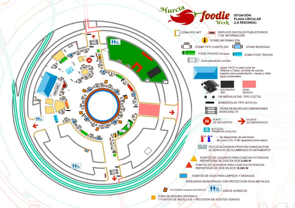 Plano situación Stands MURCIA FOODIE WEEK 2025. Todos los stands disponibles se encuentran númerados para su referencia y localización.